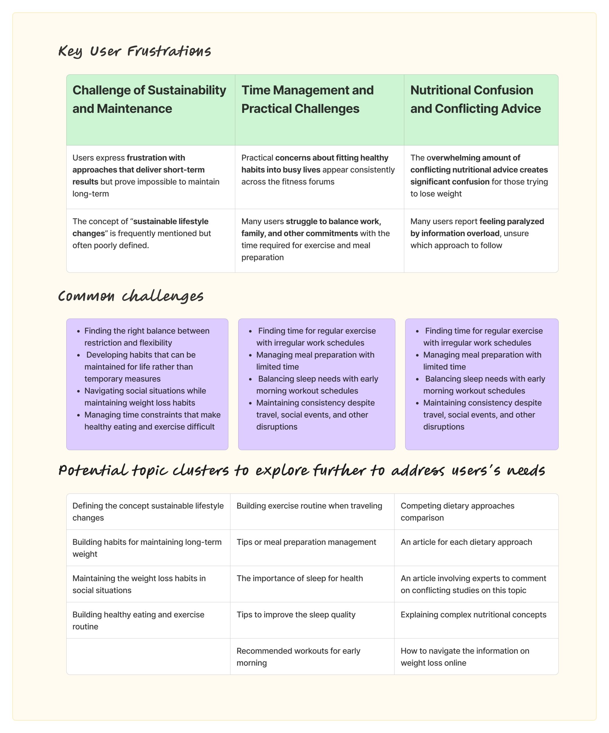 This analysis helped identify key user frustrations, common challenges, and provide content suggestions to address them.